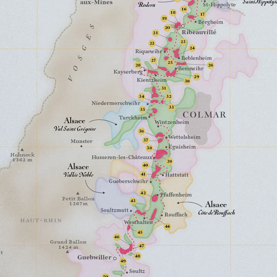 Les cépages emblématiques de la région sont le Riesling, le Gewurztraminer et le Pinot Gris, chacun offrant des arômes et des saveurs uniques.
